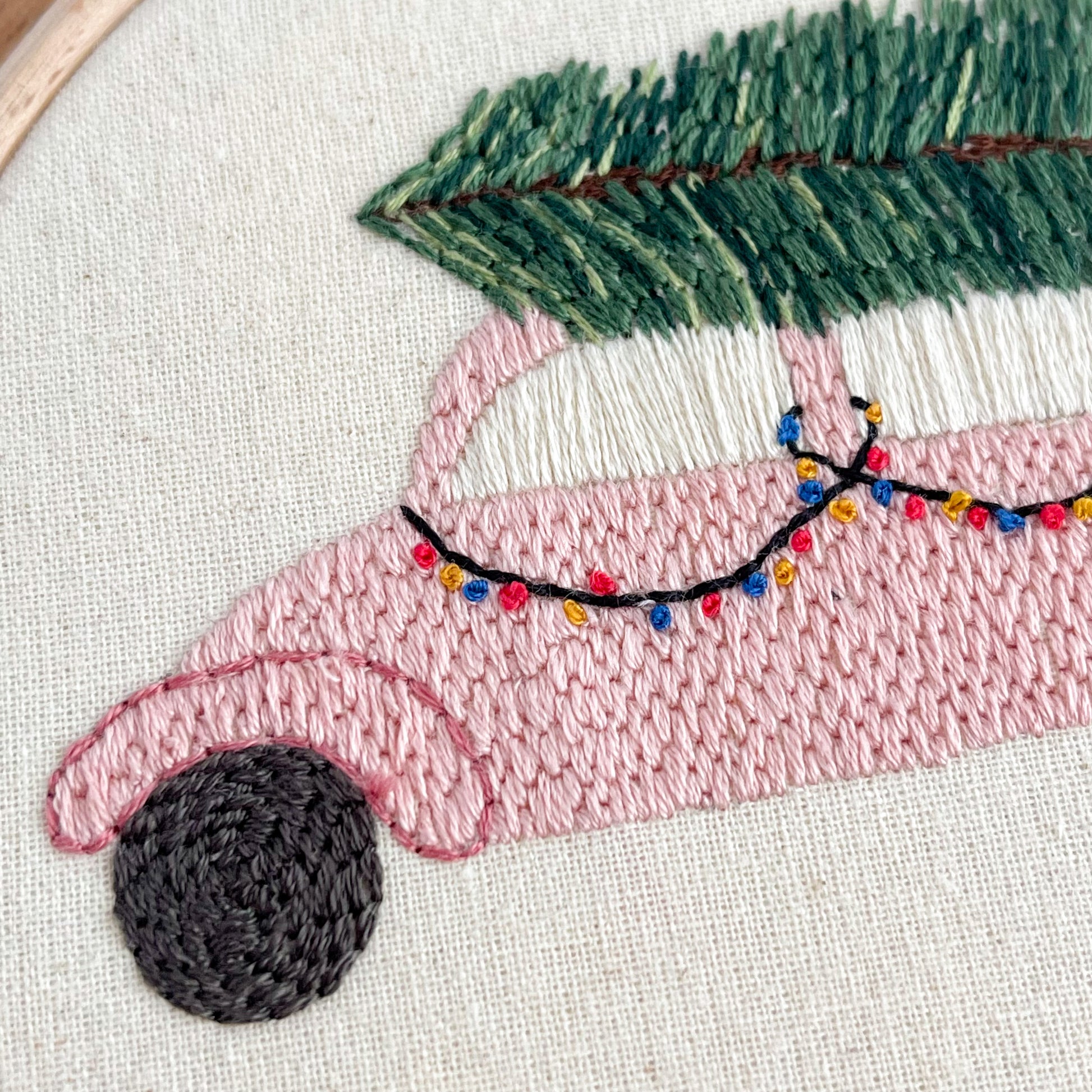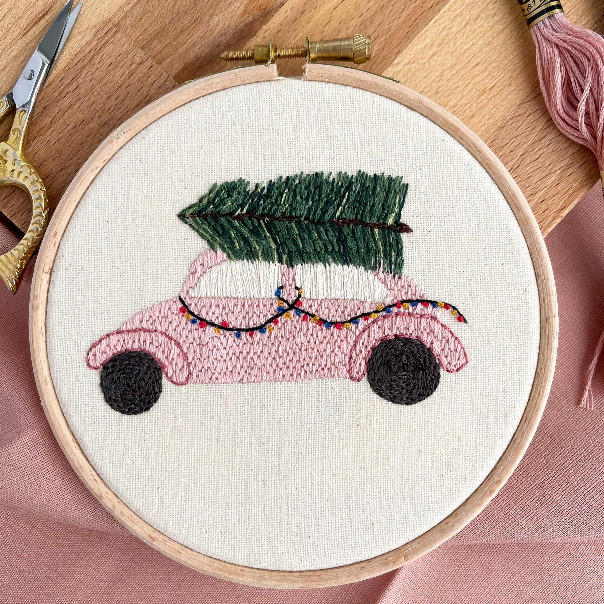 Learn how to embroider this Christmas car design with an easy to use PDF pattern! Perfect for some festive stitching - get cosy by the fire and experience the slow craft of embroidery.