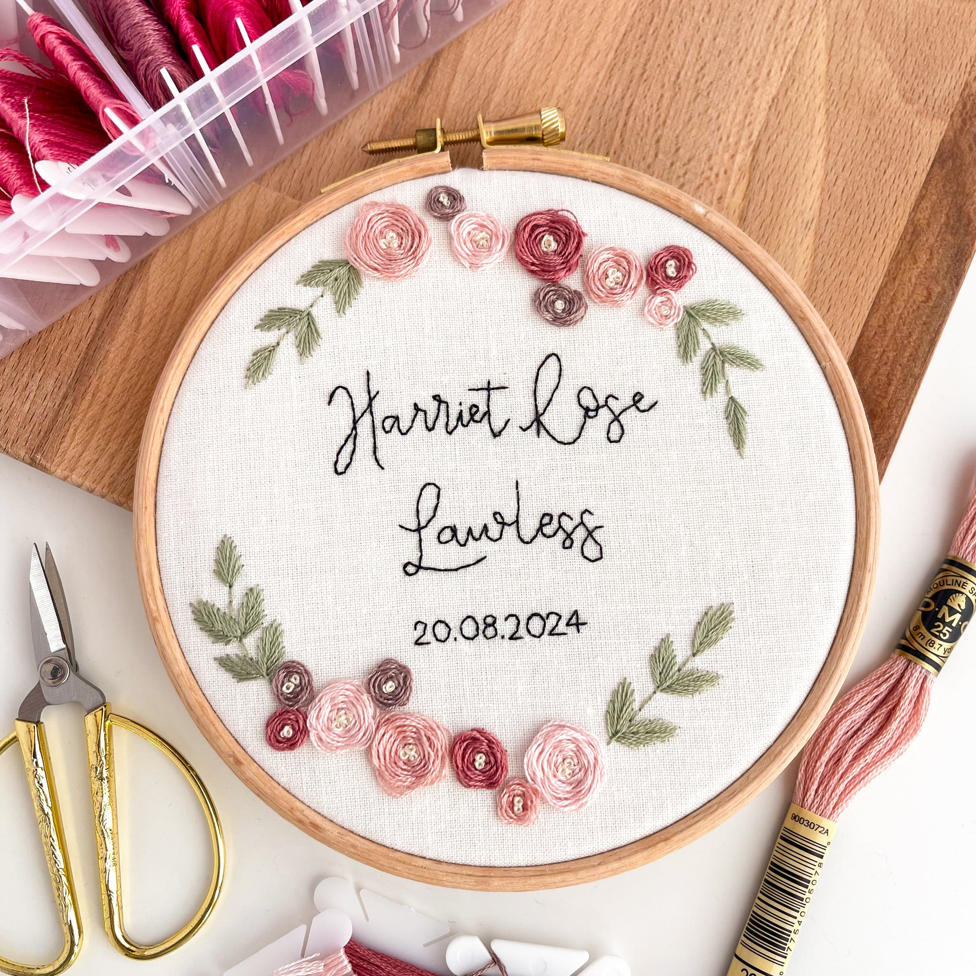 Enter above your personalisation - including name, date of birth and colours. e.g. 'Harriet Rose Lawless, 20.08.2024, pastel pinks'.