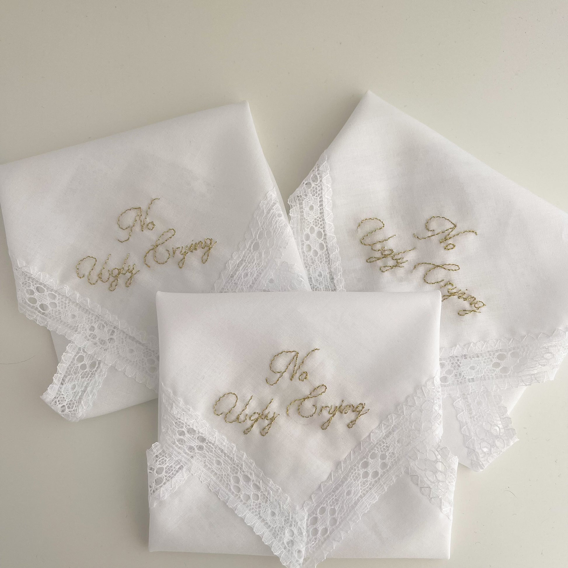 Embroidered by hand in high quality embroidery thread, white handkerchief. Lace handkerchiefs measure 26cm x 26cm, no lace/plain edge handkerchief measure 40cm x 40cm.