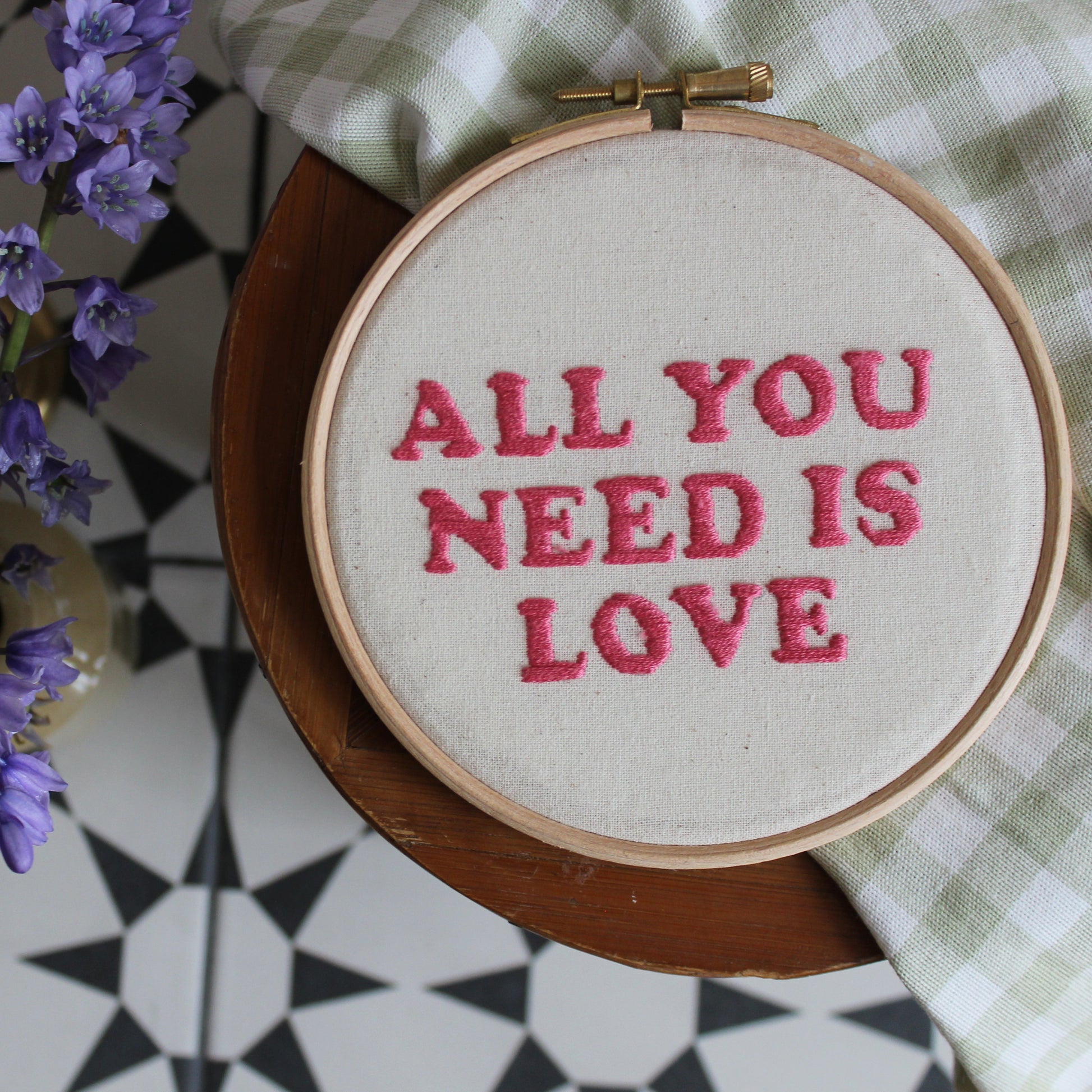 Choose from either white calico fabric with pink embroidery thread, or pink cotton fabric with red embroidery thread. Framed in a 5" wooden embroidery hoop.