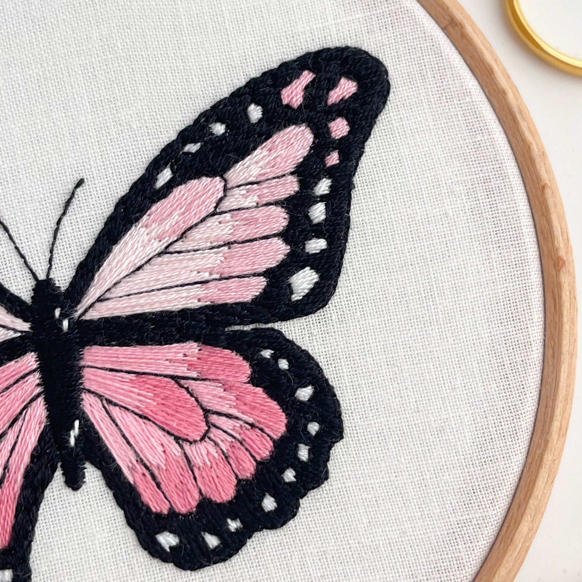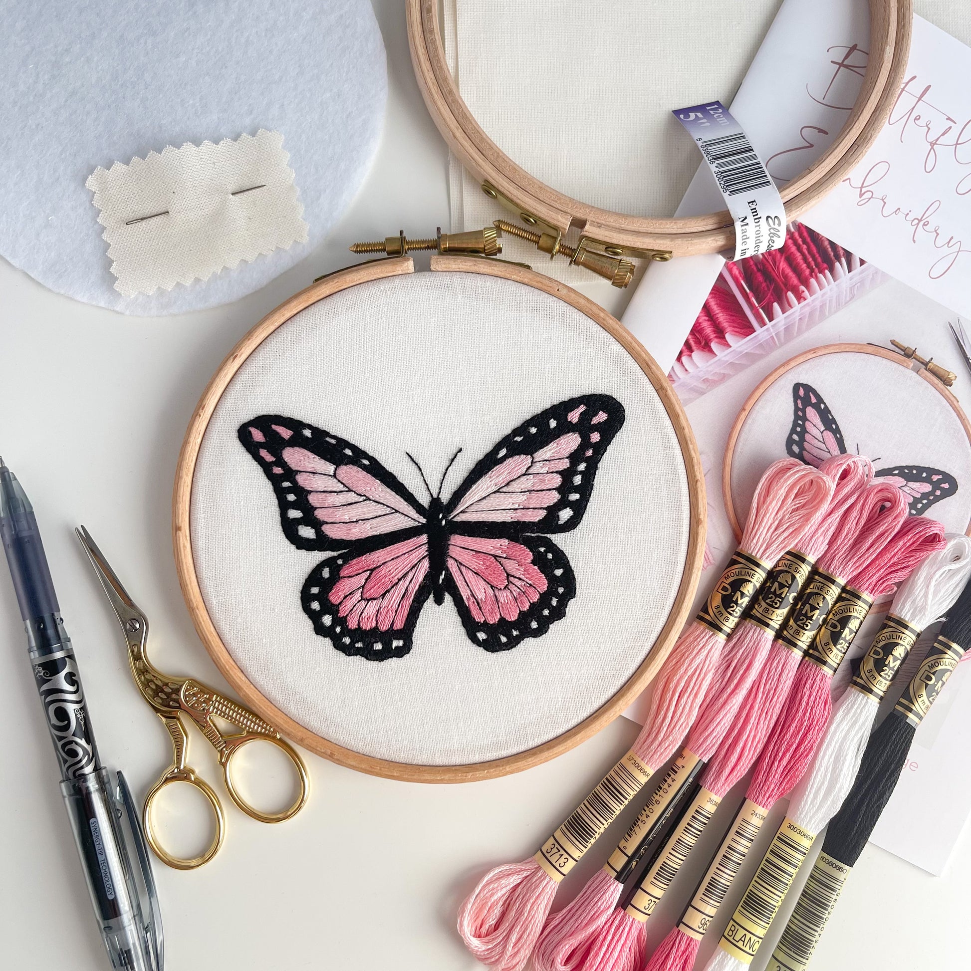 Learn how to embroider this detailed pink butterfly with this full embroidery kit, with everything you need to make the design.
